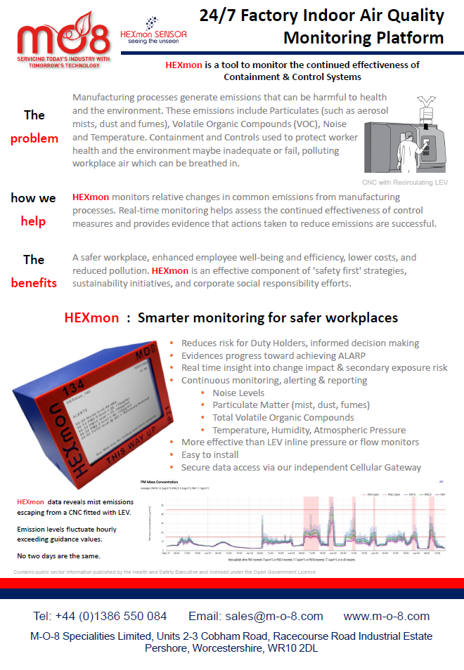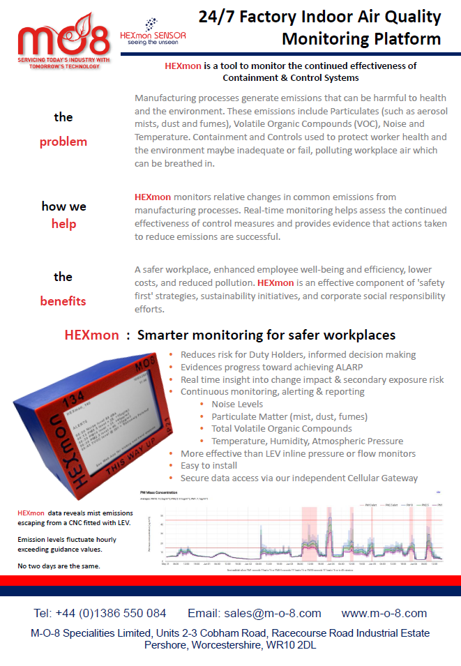 HEXmon is a 24/7 factory indoor air quality monitoring solution. Offering automated monitoring and reporting service developed to trend emmisions from traditional manufacturing processes. HEXmon has helped better understand, previously unrealised, emmisions from mineral oil based metalworking fluids, even when mist extractors are used. HEXmon was developed from shopfloor experience and we have the scientific background to turn health & safety challenges into positive actionable insight to improve health, safety and manufacturing performance.